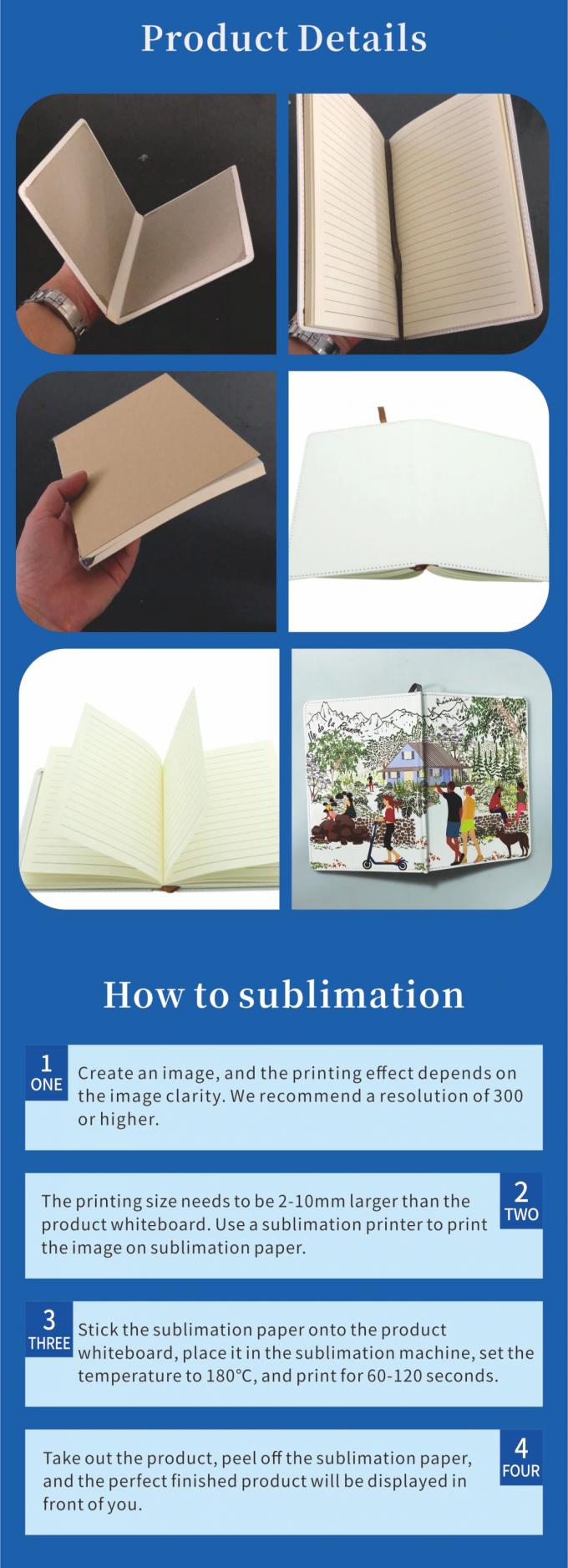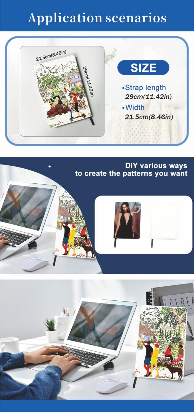 1. 昇華対応: PUカバーは昇華印刷専用に設計されており、鮮やかでフルカラーのデザインが可能です。ロゴ、個人的なアートワーク、またはユニークなパターンでカスタマイズする場合でも、これらのノートはデザインがシャープで鮮やかに仕上がる高品質な表面を提供します。